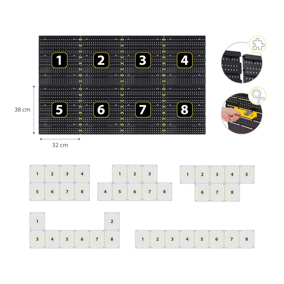 Plošča je sestavljena iz 6 modularnih delov, ki se povezujejo v eno samo površino. Proizvajalec je izbral materiale s poudarkom na vzdržljivosti – trpežne plastične komponente dopolnjujejo robustno podlago plošče. Zahvaljujoč temu izdelku lahko steno učinkovito uporabite za organizacijo vijakov, orodja, ključev in večjih delov, medtem ko ima vsak kos orodja svoje fiksno mesto in je vedno pri roki.