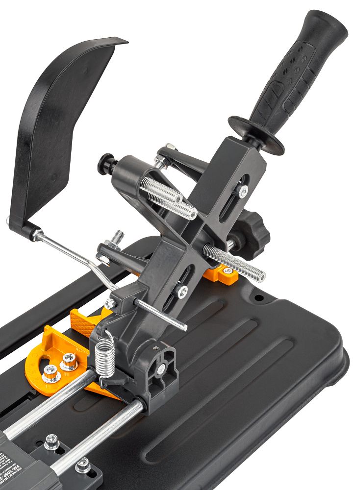 Nastavljiv ščitnik rezila ščiti pred iskrami in letečimi delci, ne da bi pri tem omejeval vidljivost materiala. To omogoča upravljavcu varno delo, hkrati pa ima popoln nadzor nad orodjem. Majhne dimenzije stojala omogočajo enostavno sestavljanje in shranjevanje, hkrati pa je izjemno vzdržljivo in funkcionalno.