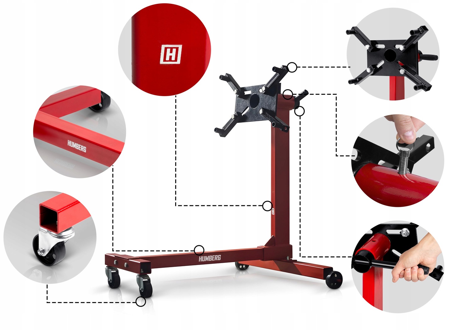 Stojalo za motor HM-385, 450 kg | Humberg je stabilen pripomoček za delavnico, ki omogoča varno montažo, demontažo in servisiranje motorjev v garaži ali delavnici. Gre za robustno in stabilno orodje za delavnico, zasnovano za varno pritrditev motorjev med servisiranjem, montažo ali demontažo.