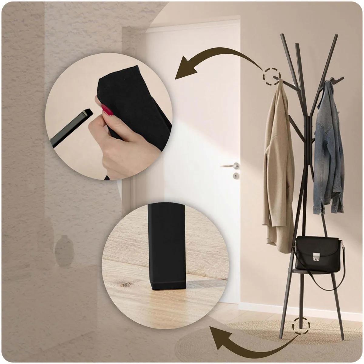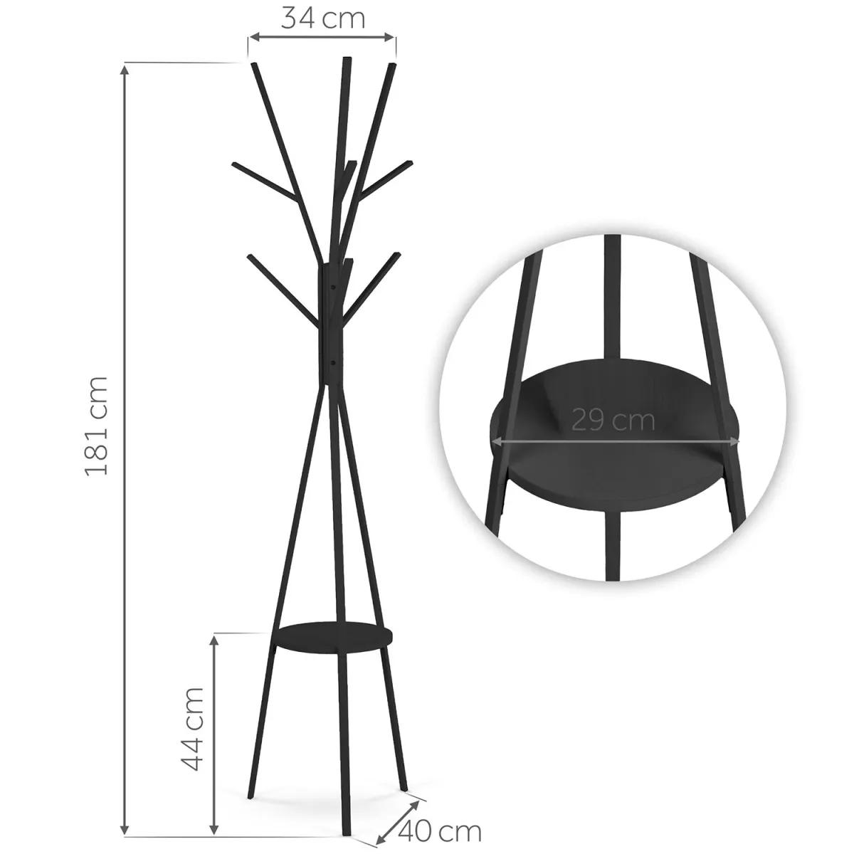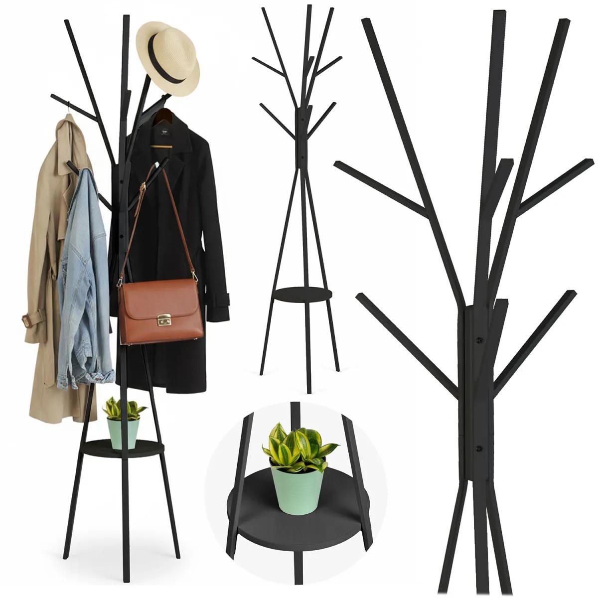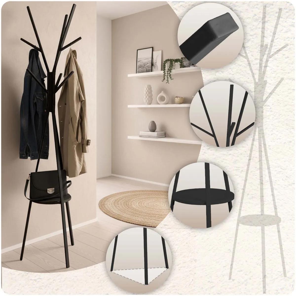 Stoječi obešalnik za oblačila MS-869, črn | Massido ponuja praktično rešitev za obešanje oblačil z dodatno polico za dodatke. Obešalnik ponuja praktično rešitev za organizacijo garderobe ali predsobe – ima več kavljev za plašče, jakne, torbe ali kape, opremljen pa je tudi s polico za manjše predmete, kot so rokavice, klobuki ali okraski. Njegova trdna konstrukcija zagotavlja stabilnost, preprosta zasnova pa se enostavno vključi v različne notranje sloge.