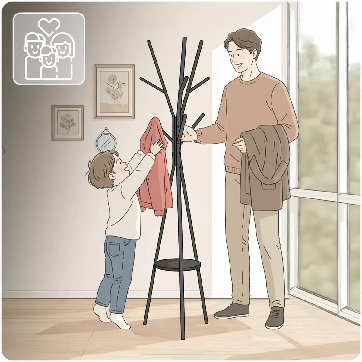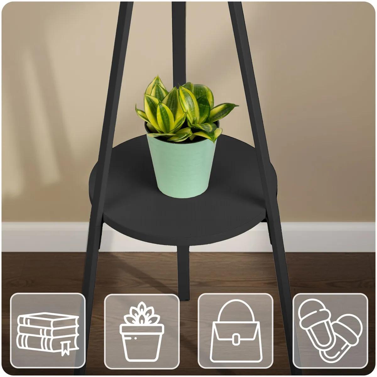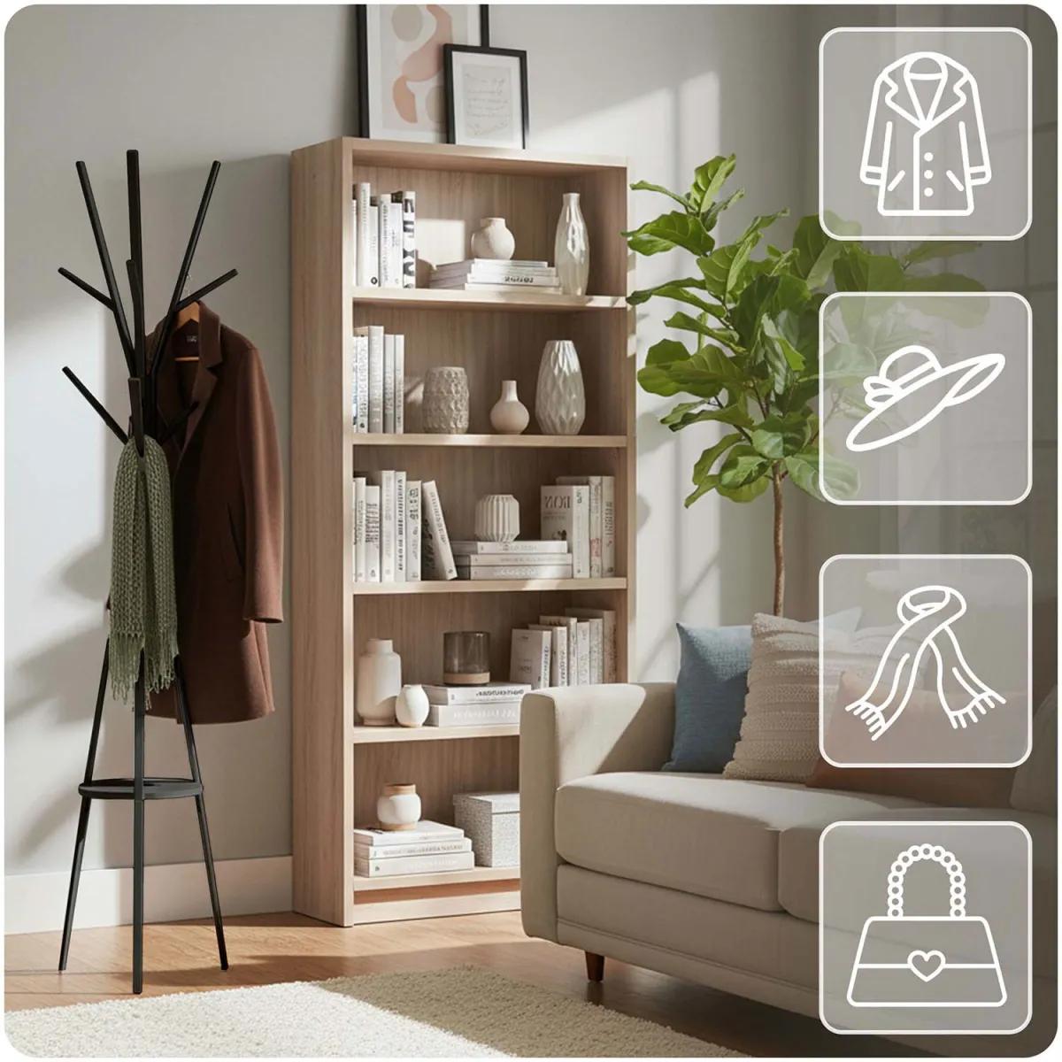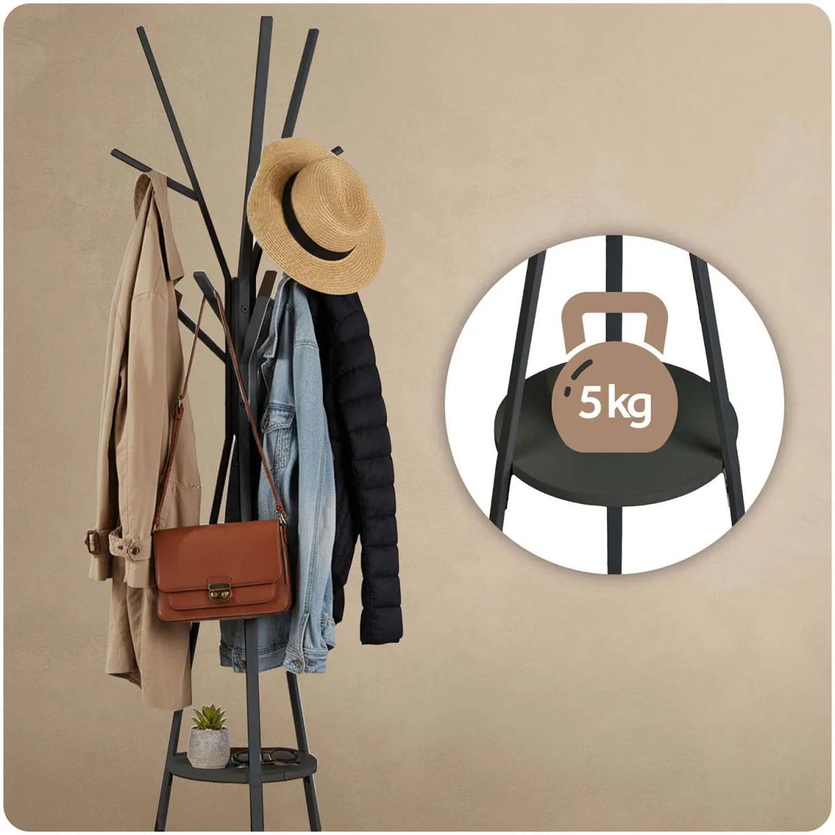 Stoječi obešalnik za oblačila MS-869, črn | Massido ponuja praktično rešitev za obešanje oblačil z dodatno polico za dodatke. Obešalnik ponuja praktično rešitev za organizacijo garderobe ali predsobe – ima več kavljev za plašče, jakne, torbe ali kape, opremljen pa je tudi s polico za manjše predmete, kot so rokavice, klobuki ali okraski. Njegova trdna konstrukcija zagotavlja stabilnost, preprosta zasnova pa se enostavno vključi v različne notranje sloge.
