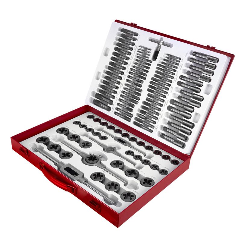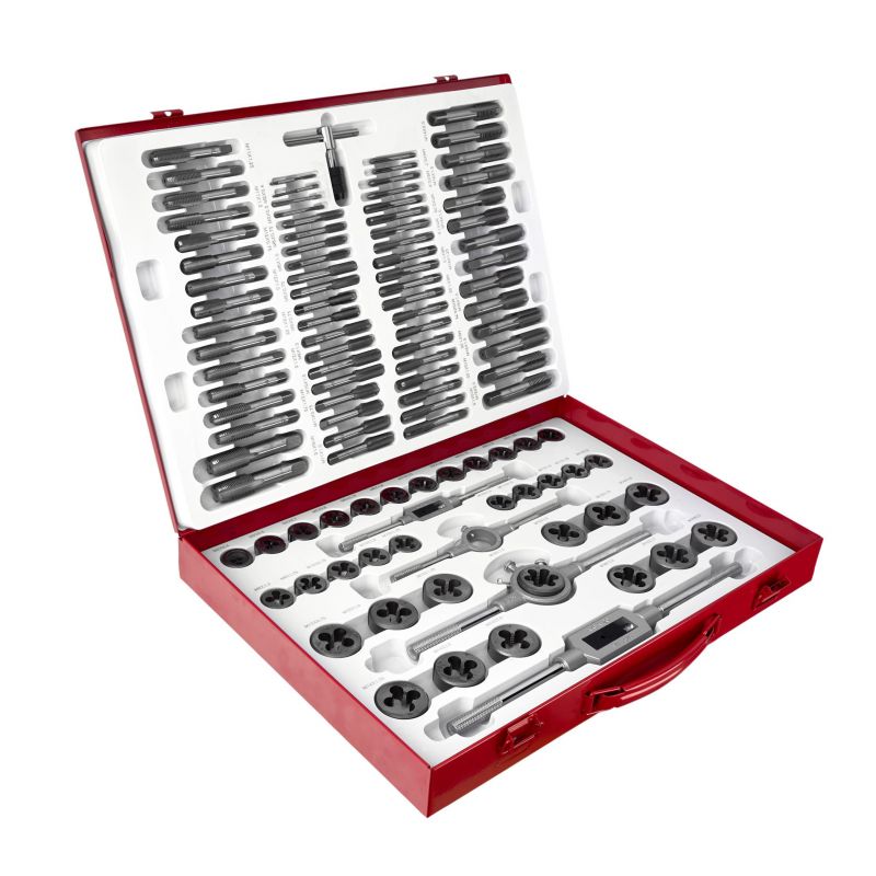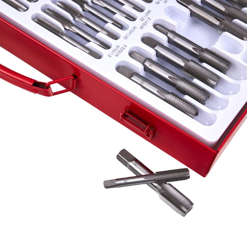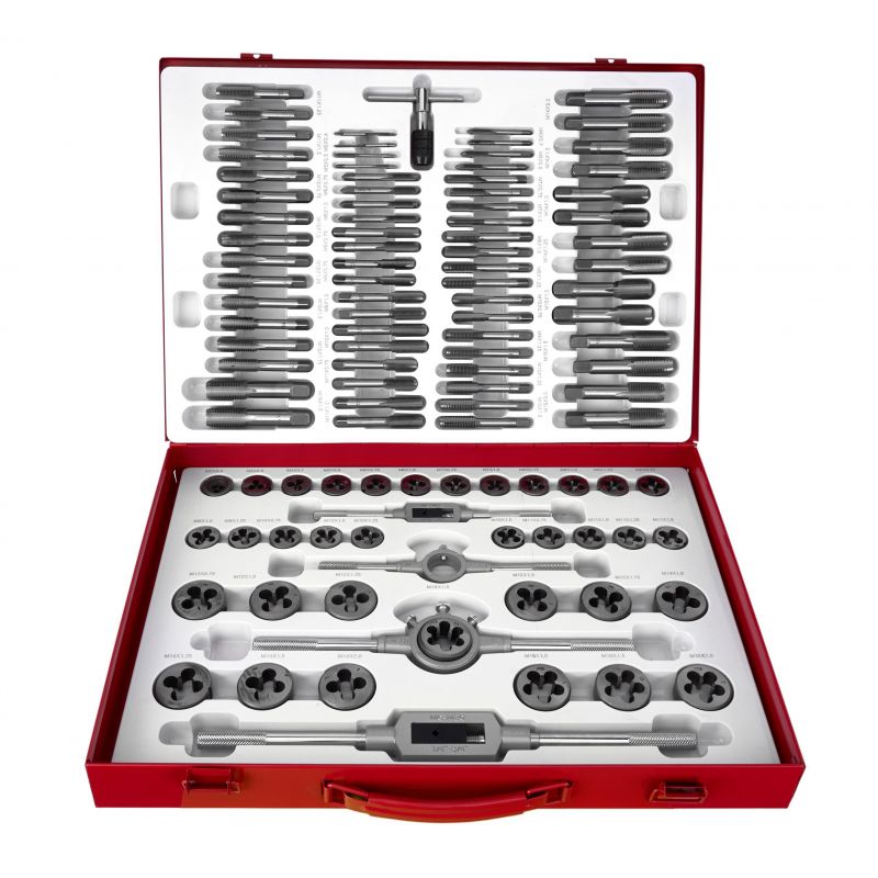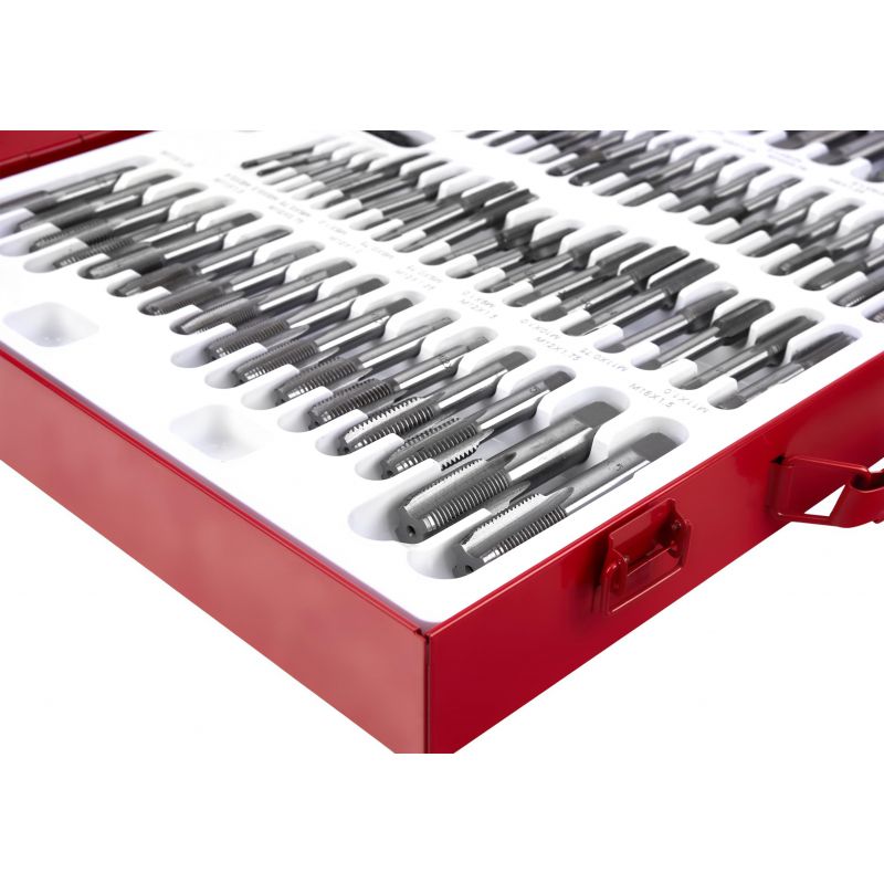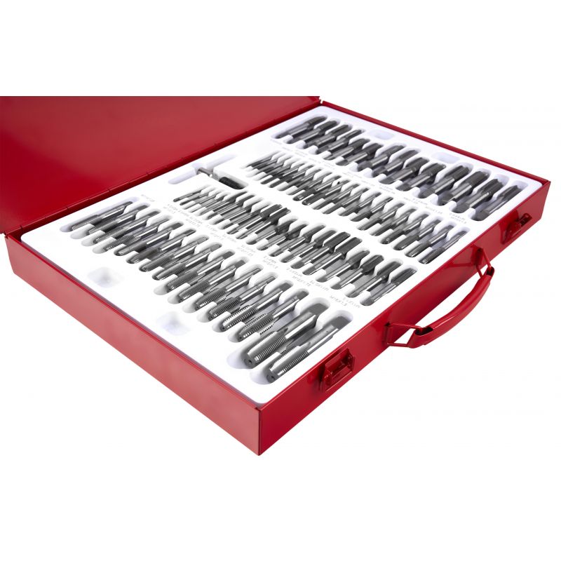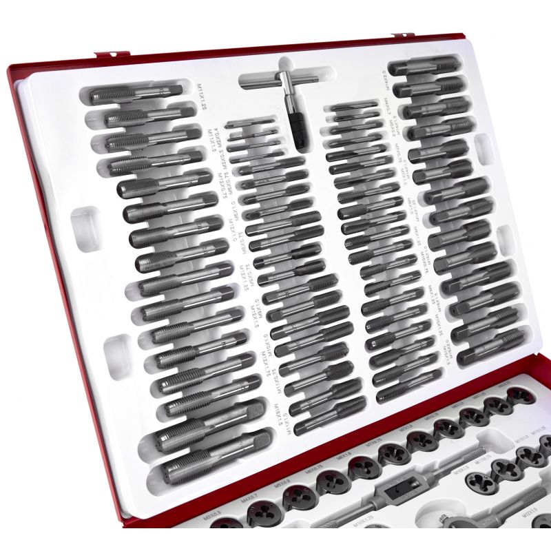 Svedri in matice, 110 kosov | KD10250 ponujajo zanesljivo rešitev za ustvarjanje in popravljanje navojev pri različnih mehanskih in delavniških delih. Komplet je izdelan iz najkakovostnejšega kaljenega jekla, zato se bo izkazal v vsaki delavnici in garaži. Komplet se uporablja za popravilo navojnih spojev vseh vrst v večini materialov. Zaradi velikega števila elementov je komplet zelo vsestranski. Pakiran je v trdnem kovinskem kovčku z namenskimi mesti za vsako orodje, da je vse urejeno.