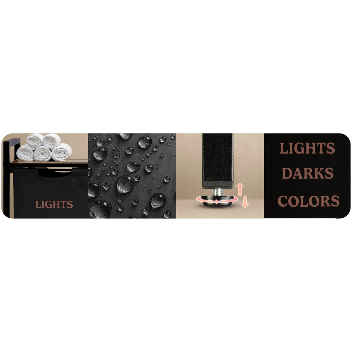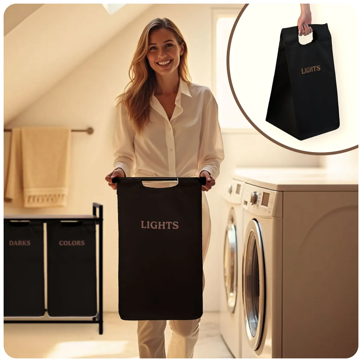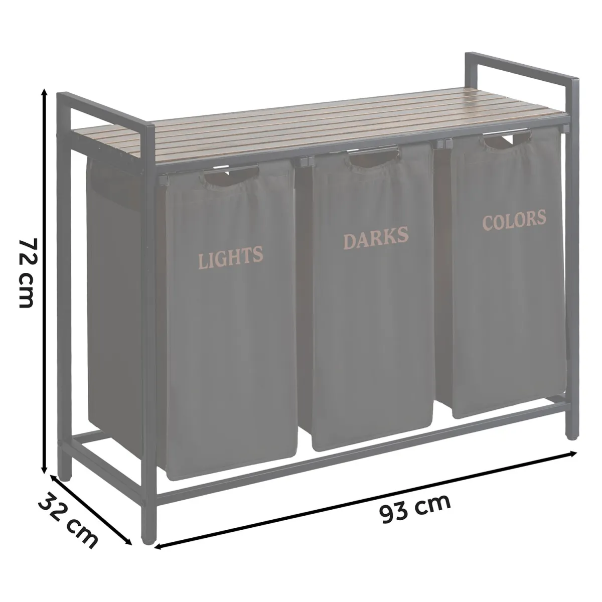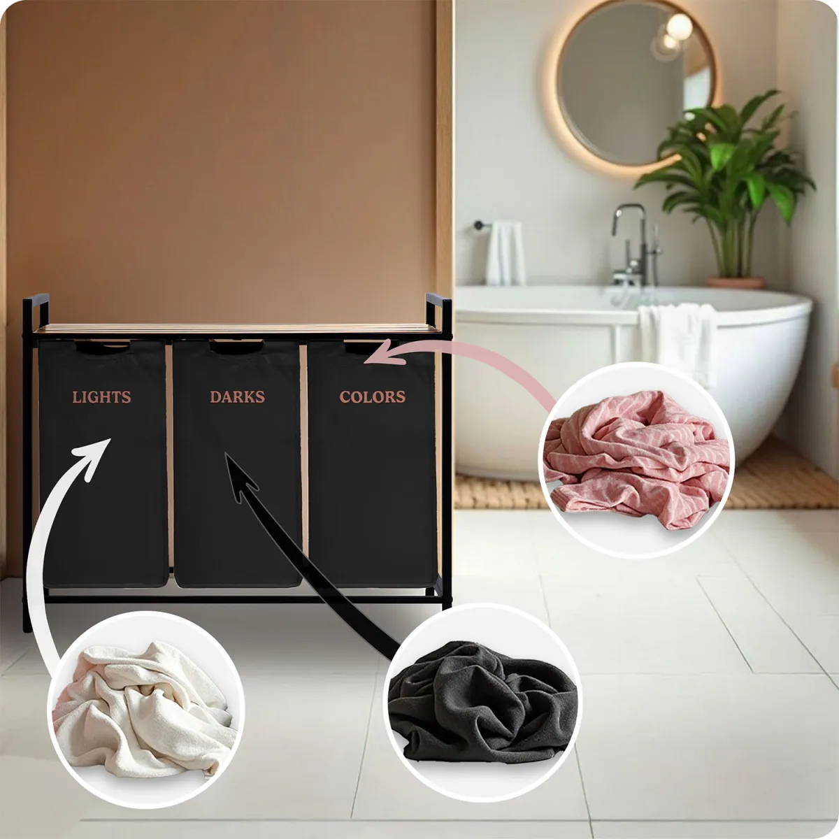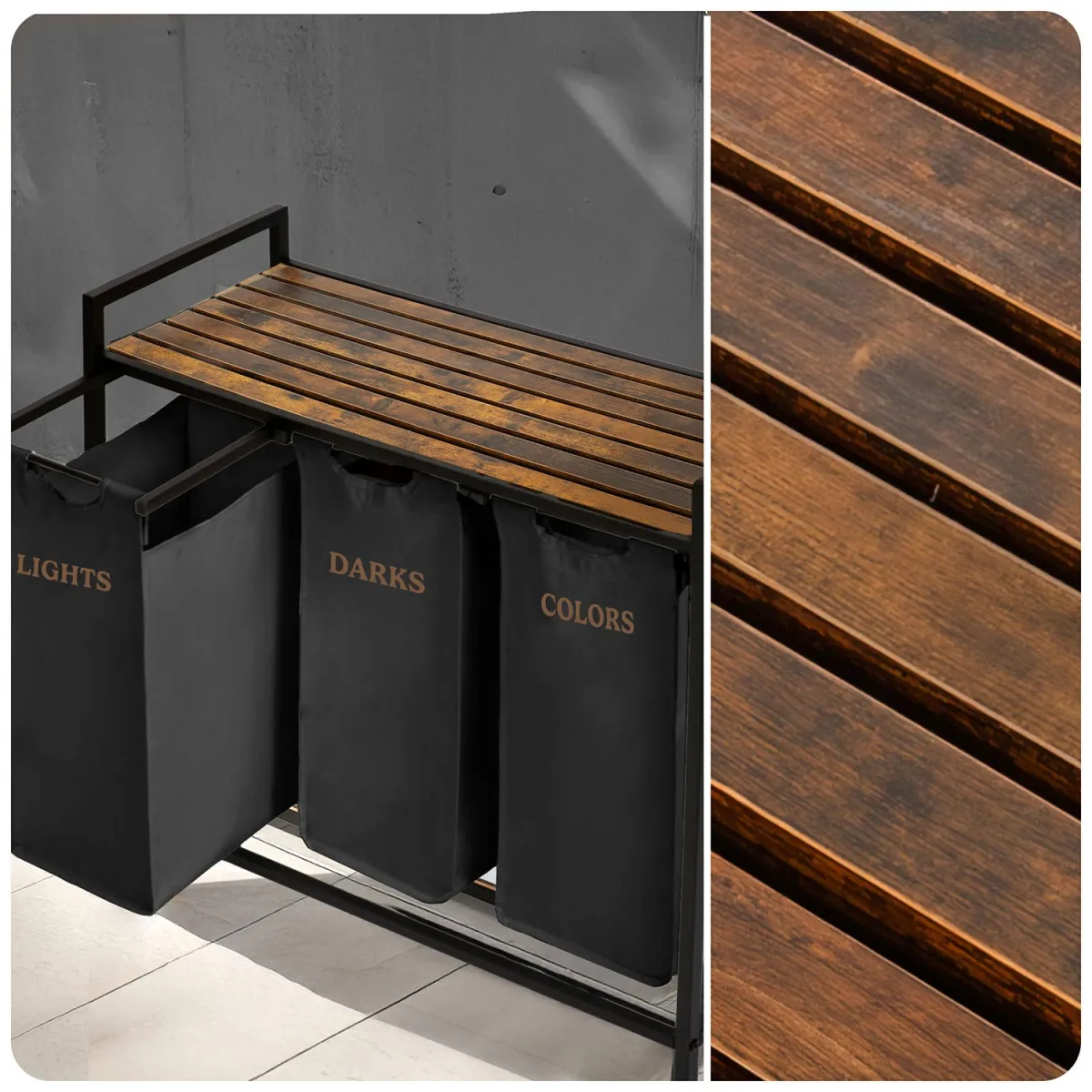 Zahvaljujoč temu sistemu prihranite čas pri pranju in brez napora vzdržujete red. Sodobna in minimalistična oblika z lesenimi in črnimi elementi se prilega večini notranjih prostorov – od kopalnice do pralnice. Tekstilna vreča je odstranljiva, enostavna za vzdrževanje in po potrebi jo preprosto odstranite ter prenesete v pralni stroj. Stabilna kovinska konstrukcija zagotavlja, da košara ne izgubi oblike, tudi ko je popolnoma napolnjena.