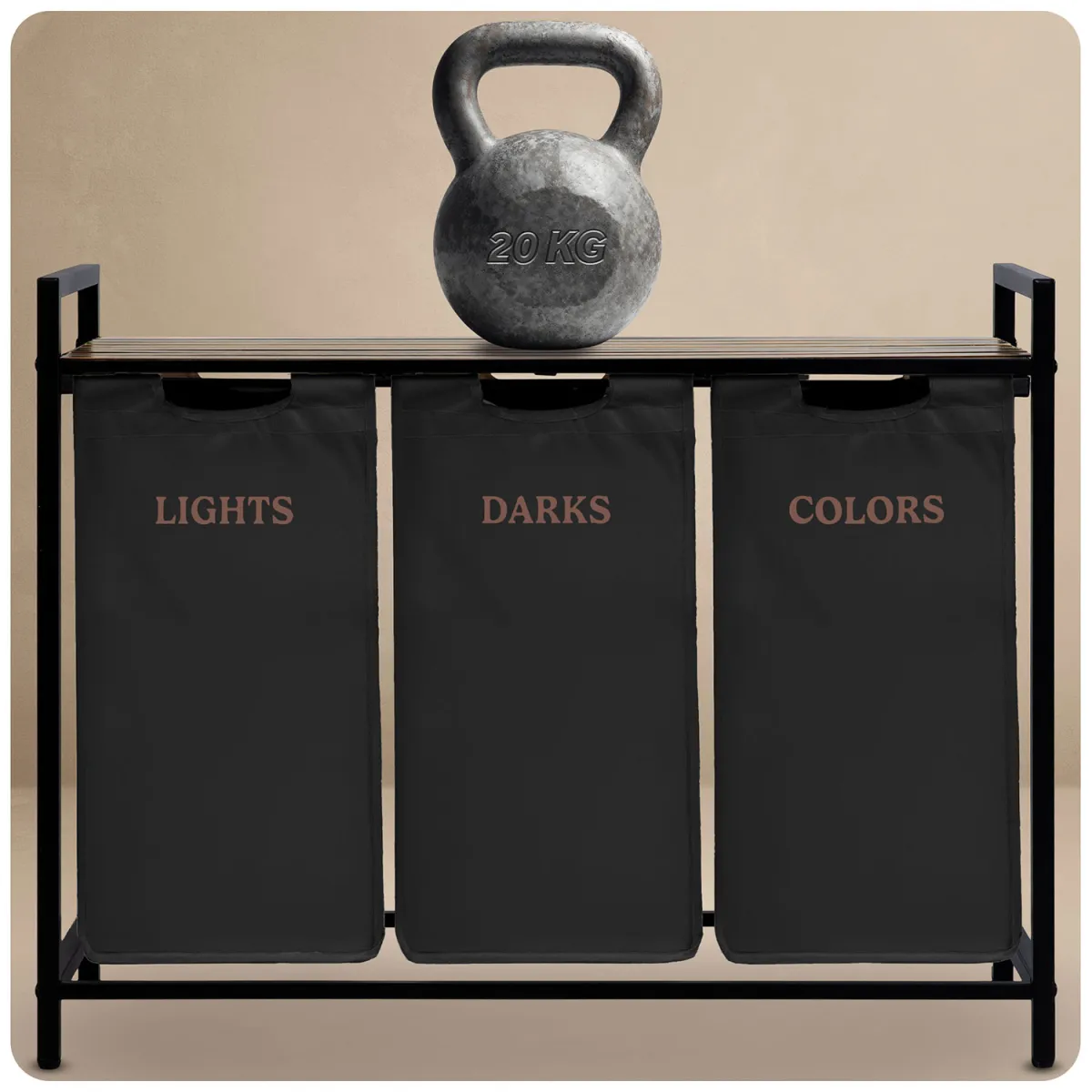 Tridelna košara za perilo z okvirjem, 120 l, črna | Massido ponuja praktično rešitev za sortiranje perila v domu v sodobnem dizajnu. Njena trdna konstrukcija združuje stabilen kovinski okvir z lahkim, a trpežnim tekstilnim vložkom, ki je razdeljen na tri ločene predelke – idealno za sortiranje svetlega, temnega in barvnega perila pri polnjenju.