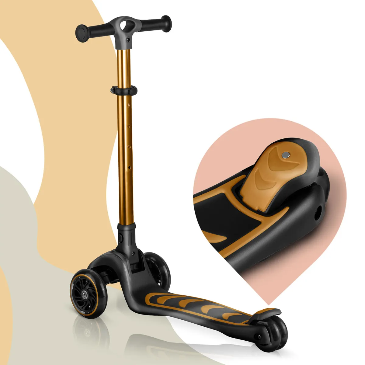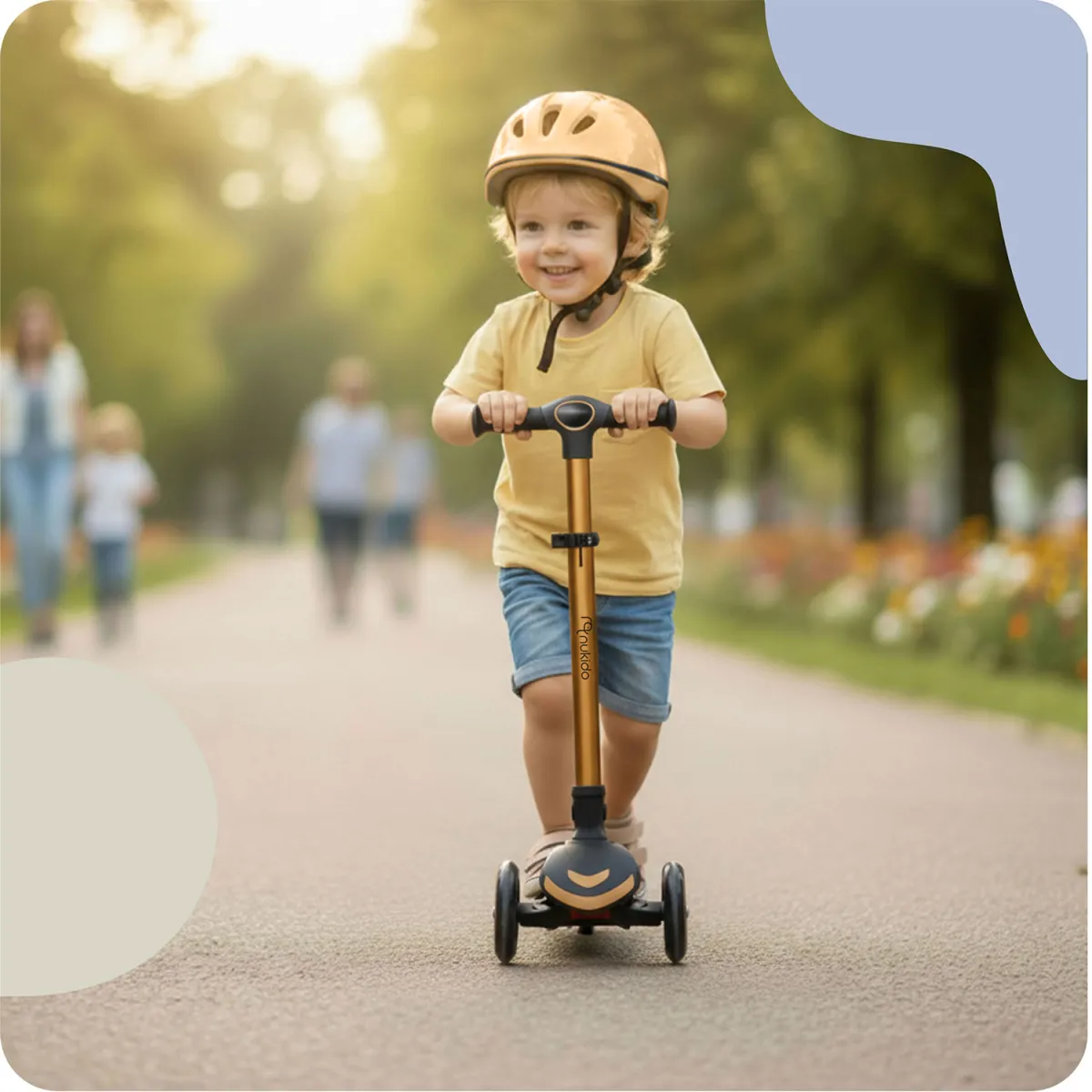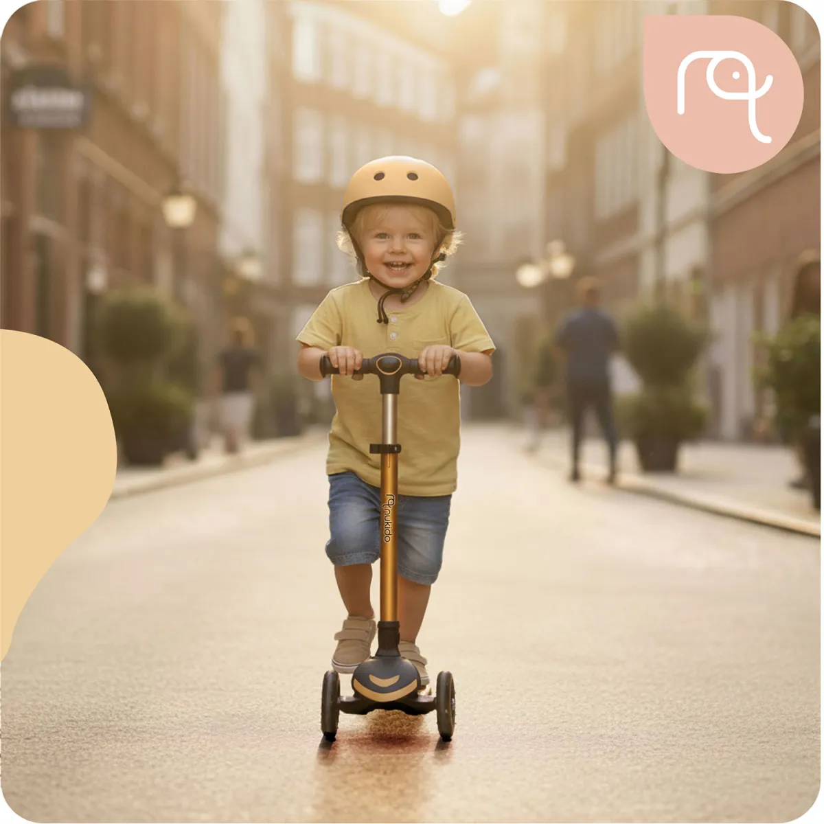 Trikolesni skiro, zlat | Nukido Flippo je varno in zabavno vozilo, ki podpira otrokovo ravnotežje in motorično koordinacijo. Zahvaljujoč trikolesni zasnovi se otroci hitreje naučijo vzdrževati ravnotežje in hkrati imajo zanesljivo podlago za igro in gibanje. Skiro ponuja široko, nedrsečo podlago, sistem zadnje zavore, ki se upravlja z nogo, in nastavljivo višino krmila oziroma sedeža, kar omogoča prilagajanje otrokovi rasti in podaljšanje njegove uporabe.