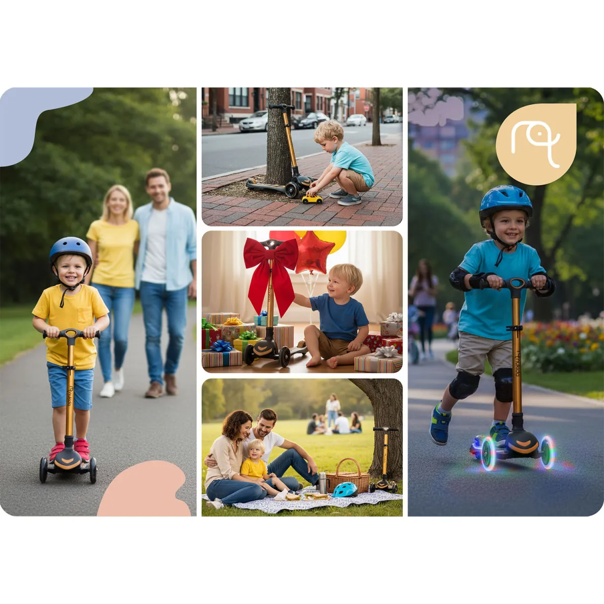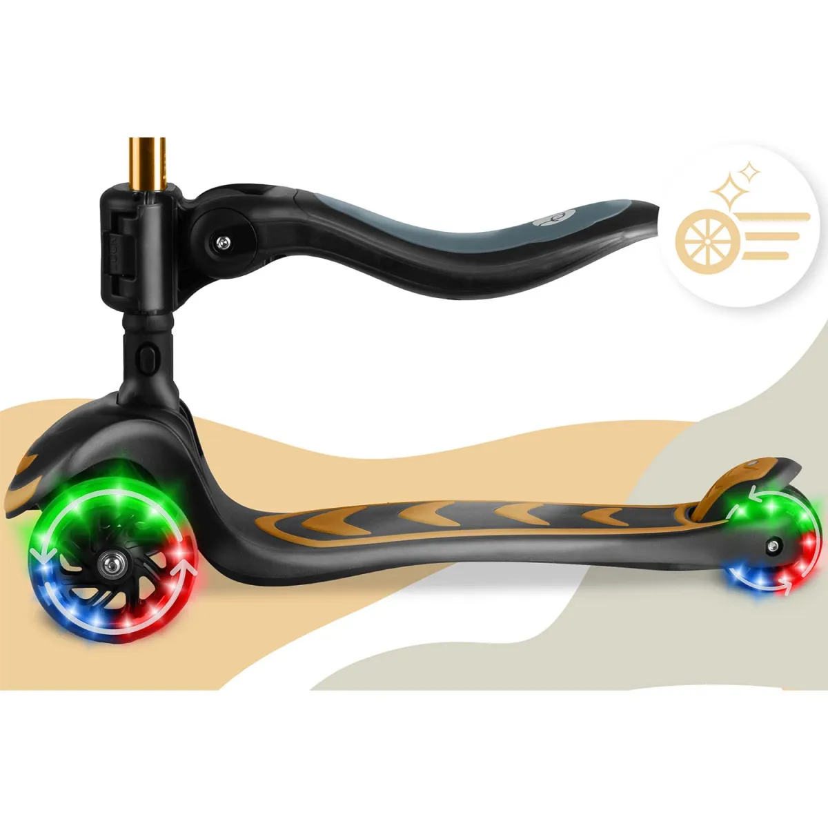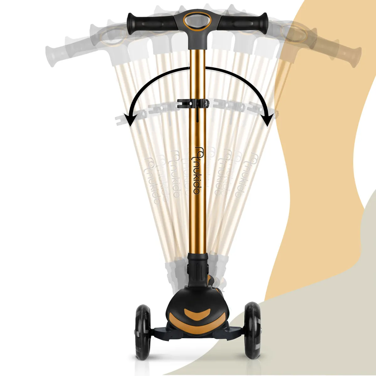 Trikolesni skiro, zlat | Nukido Flippo je varno in zabavno vozilo, ki podpira otrokovo ravnotežje in motorično koordinacijo. Zahvaljujoč trikolesni zasnovi se otroci hitreje naučijo vzdrževati ravnotežje in hkrati imajo zanesljivo podlago za igro in gibanje. Skiro ponuja široko, nedrsečo podlago, sistem zadnje zavore, ki se upravlja z nogo, in nastavljivo višino krmila oziroma sedeža, kar omogoča prilagajanje otrokovi rasti in podaljšanje njegove uporabe.