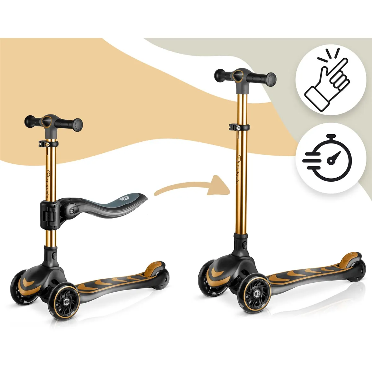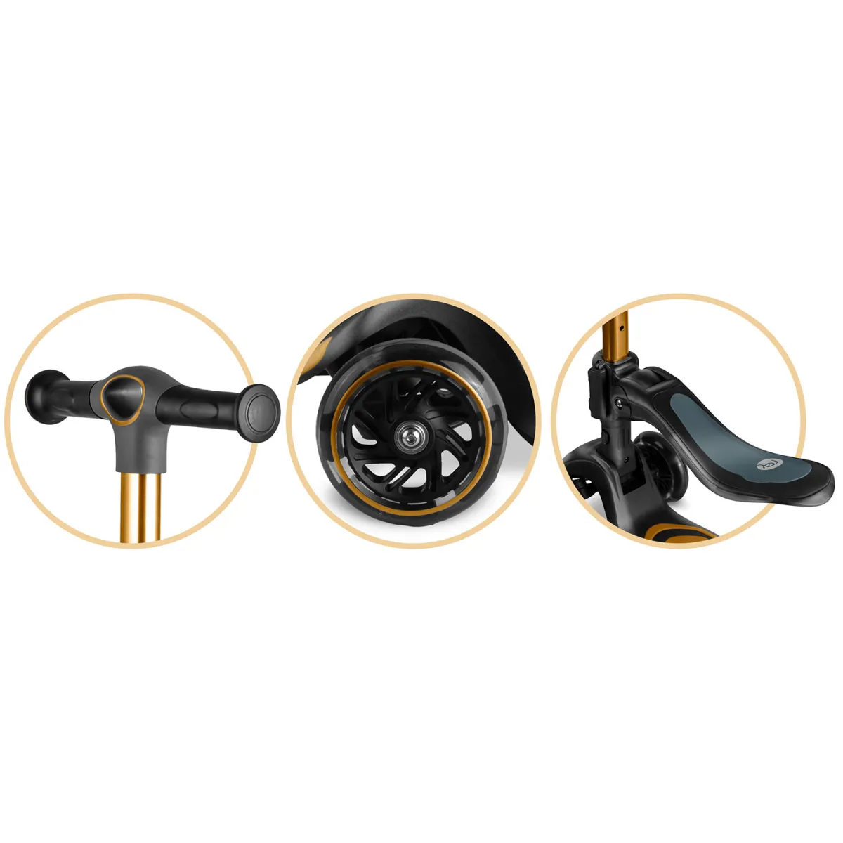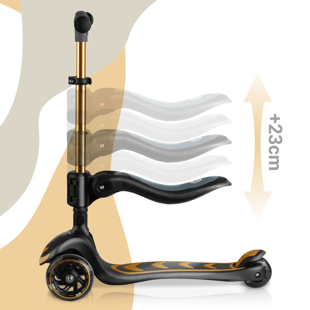 Snemljiv sedež omogoča prehod iz sedeče v stoječo vožnjo, zaradi česar je naprava univerzalna izbira tako za manjše kot večje otroke. Skiro je opremljen tudi z varnostnimi certifikati (EN 71-1,2,3), njegova največja nosilnost pa je do 50 kg – zato je dovolj robusten tudi za starejše otroke. Elegantna zlata površina doda stilski element, zaradi česar je model odlično darilo ali dodatek otroški sobi ali zunanjemu igralnemu prostoru.