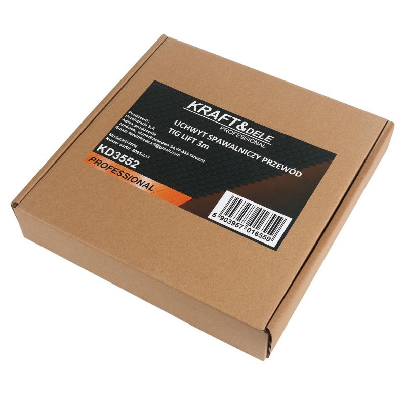 Varilni gorilnik, TIG LIFT, 3 m | KD3552 je visokokakovosten 3-metrski TIG kabel, zasnovan za natančno TIG varjenje z vžigom na dotik (LIFT). Združljiv je z večino TIG DC varilnih aparatov in idealen za delo z materiali, kot so nerjaveče jeklo, ogljikovo jeklo in baker. Ima robustno konstrukcijo, ergonomsko obliko in celoten komplet dodatkov, ki vam omogočajo hiter začetek dela. Zahvaljujoč kompaktni zasnovi in skrbno izbranim materialom zagotavlja udobje uporabe in visoko natančnost obloka. Odlična izbira za profesionalce in zahtevne ljubitelje TIG varjenja.