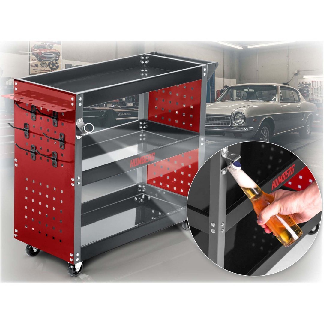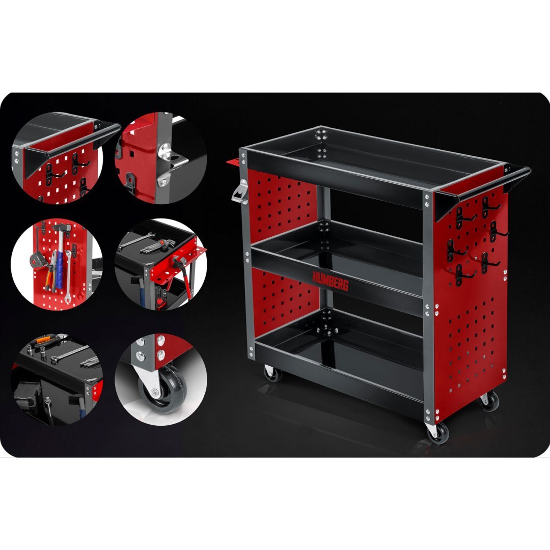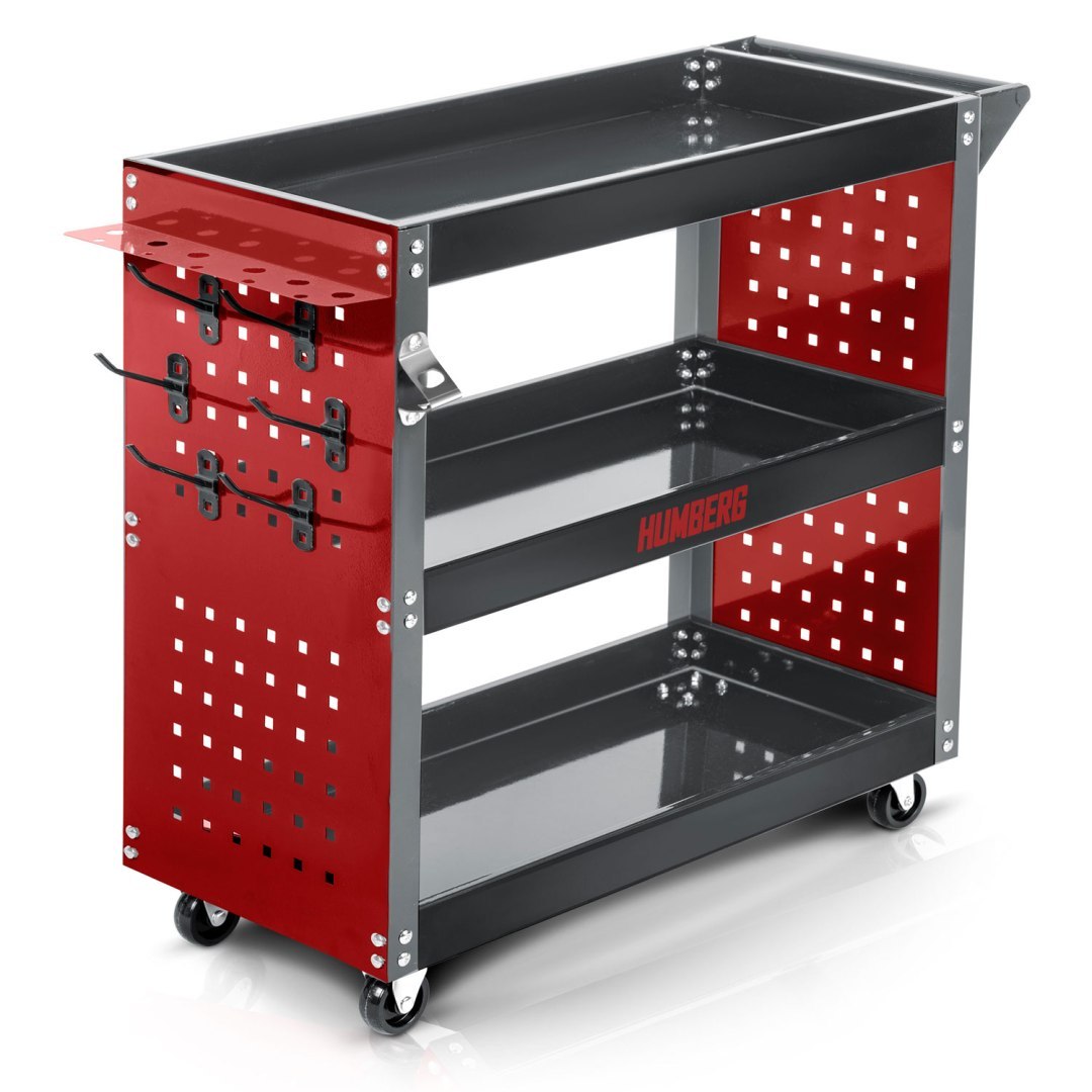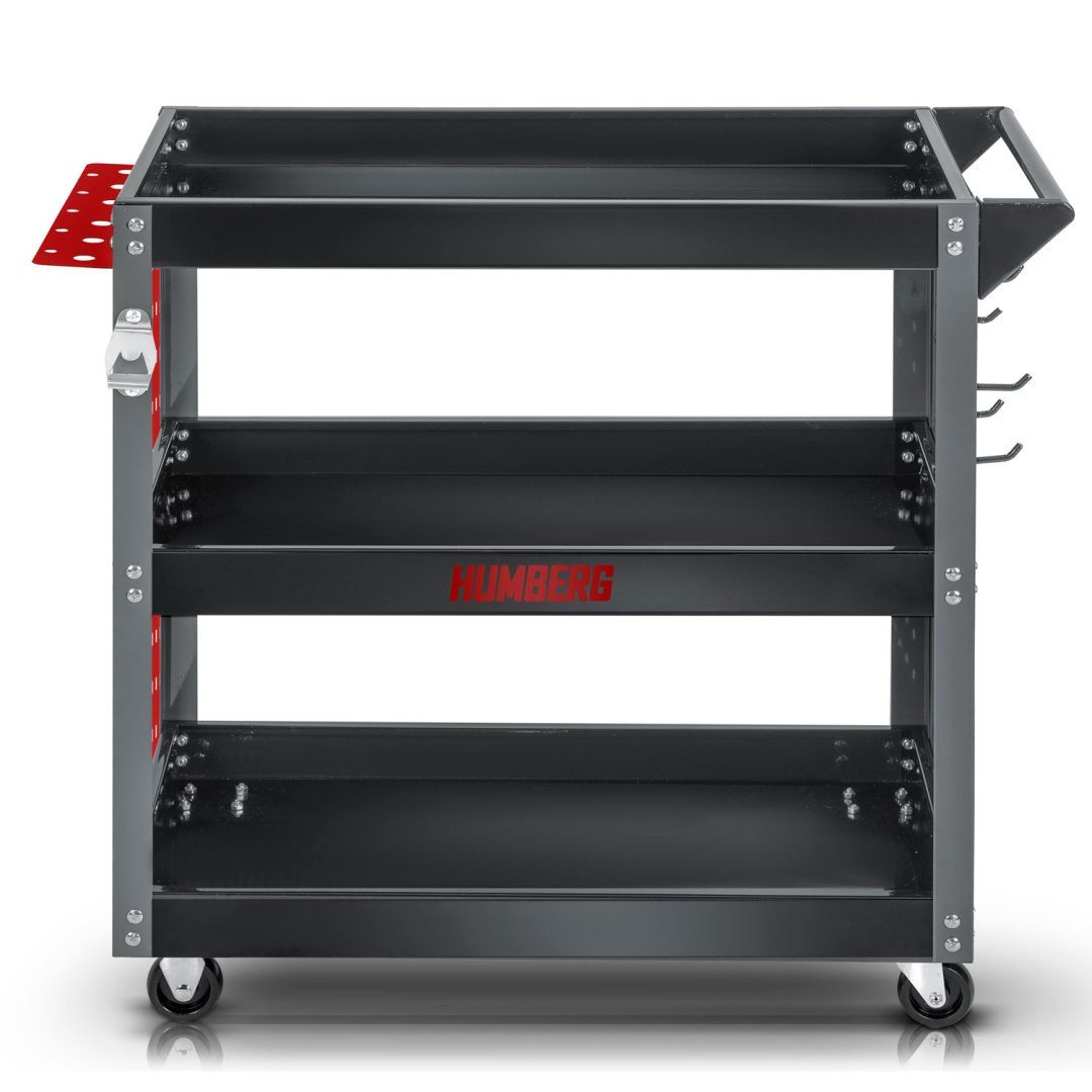 Voziček za orodje za delavnico HM-515, 300 kg | Humberg je idealen za shranjevanje in prevoz orodja, delov ali drugega pribora. Zasnovan je posebej za uporabo v delavnici in je primeren tako za profesionalne storitve kot za domačo garažno uporabo. Izdelan je iz nerjavečega jekla in aluminija, kar zagotavlja vzdržljivost in odpornost proti koroziji. Teža tovora, ki ga lahko prevažate na vozičku, je do 300 kg!