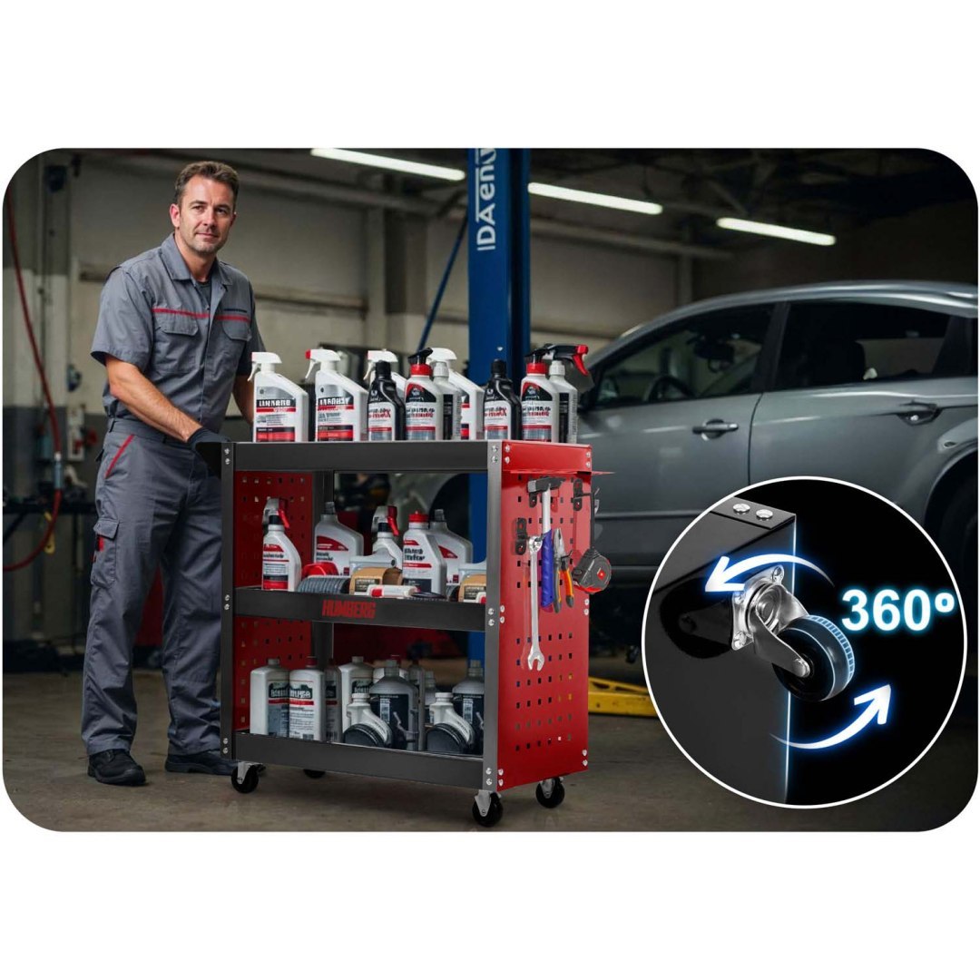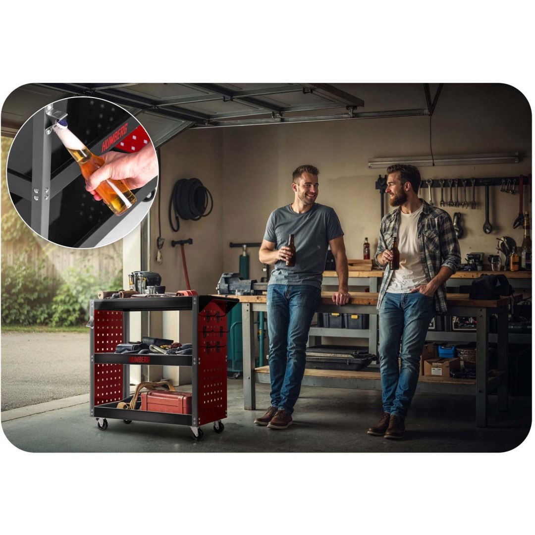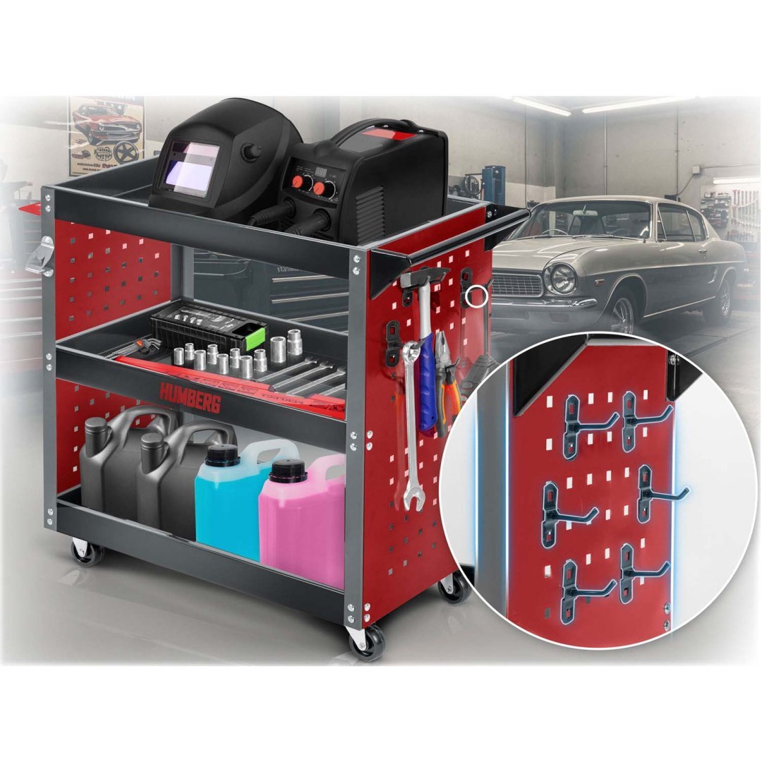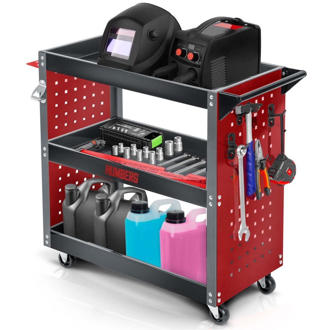 Voziček za orodje za delavnico HM-515, 300 kg | Humberg je idealen za shranjevanje in prevoz orodja, delov ali drugega pribora. Zasnovan je posebej za uporabo v delavnici in je primeren tako za profesionalne storitve kot za domačo garažno uporabo. Izdelan je iz nerjavečega jekla in aluminija, kar zagotavlja vzdržljivost in odpornost proti koroziji. Teža tovora, ki ga lahko prevažate na vozičku, je do 300 kg!
