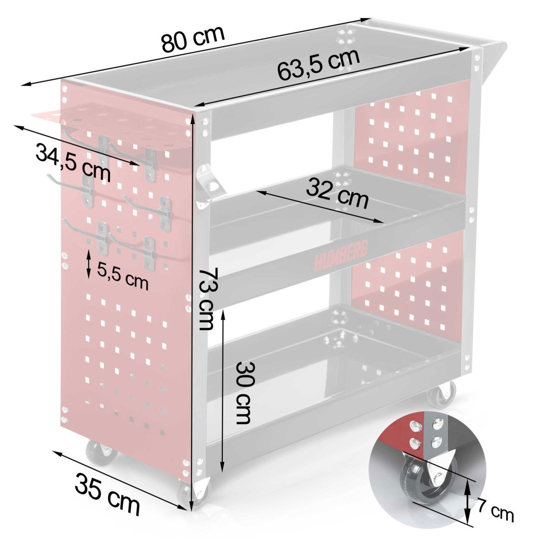 Ima tri velike ploščadi iz visokokakovostne profilirane pločevine, ki zagotavljajo vzdržljivost in dovolj prostora za priročno shranjevanje in prevoz orodja in pribora. Voziček ima šest kavljev za maksimalno organizacijo orodja. Prihranijo prostor v predalih in na delovni površini. Omogočajo hiter dostop do najpogosteje uporabljenega orodja. Izdelan je iz trpežnih materialov – odporen na velike obremenitve.