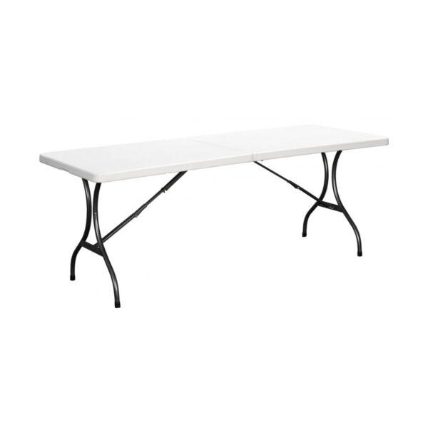 Vrtna gostinska miza, zložljiva – bela, 240×70 cm | Model: ZK-240 je idealna rešitev za vsak dogodek na prostem! Mizna plošča je izdelana iz trpežne plastike v praktični velikosti (240 x 70 cm), kar zagotavlja visoko udobje pri uporabi. Zahvaljujoč hitremu zlaganju mize v kovčku s praktičnim ročajem transport ali shranjevanje ne povzročata težav. Miza bo popolna ne samo doma, ampak tudi na vseh potovanjih. Trdna konstrukcija jeklene mize zagotavlja stabilnost. Dodatna ključavnica ščiti pred nenamernim zlaganjem. Noge mize so zaščitene z gumijastimi podlogami, ki ščitijo površino pred praskami. Celotna miza je izdelana estetsko, v atraktivni beli barvi.