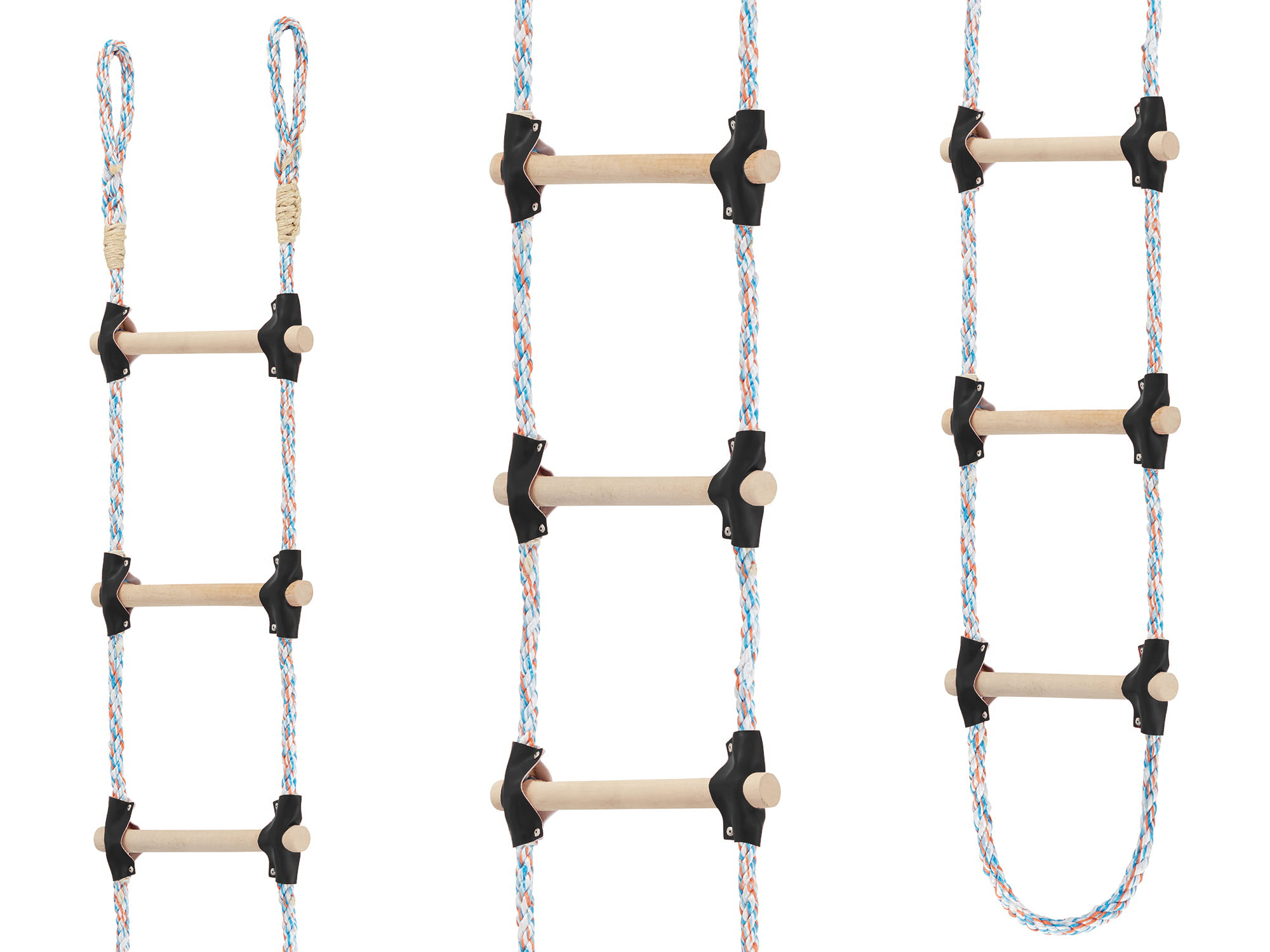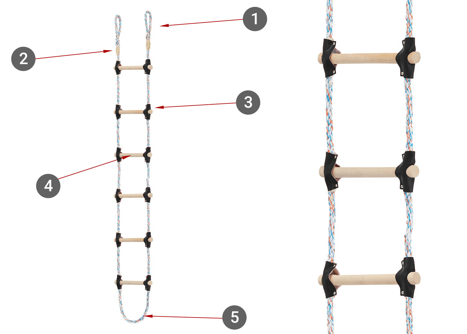 - Posebne ojačitve iz jutene vrvi – pritrditve so dodatno zavarovane z zaščitniki iz jutene vrvi, ki v dolžini približno 10 cm pritrdijo glavne vrvi lestve.