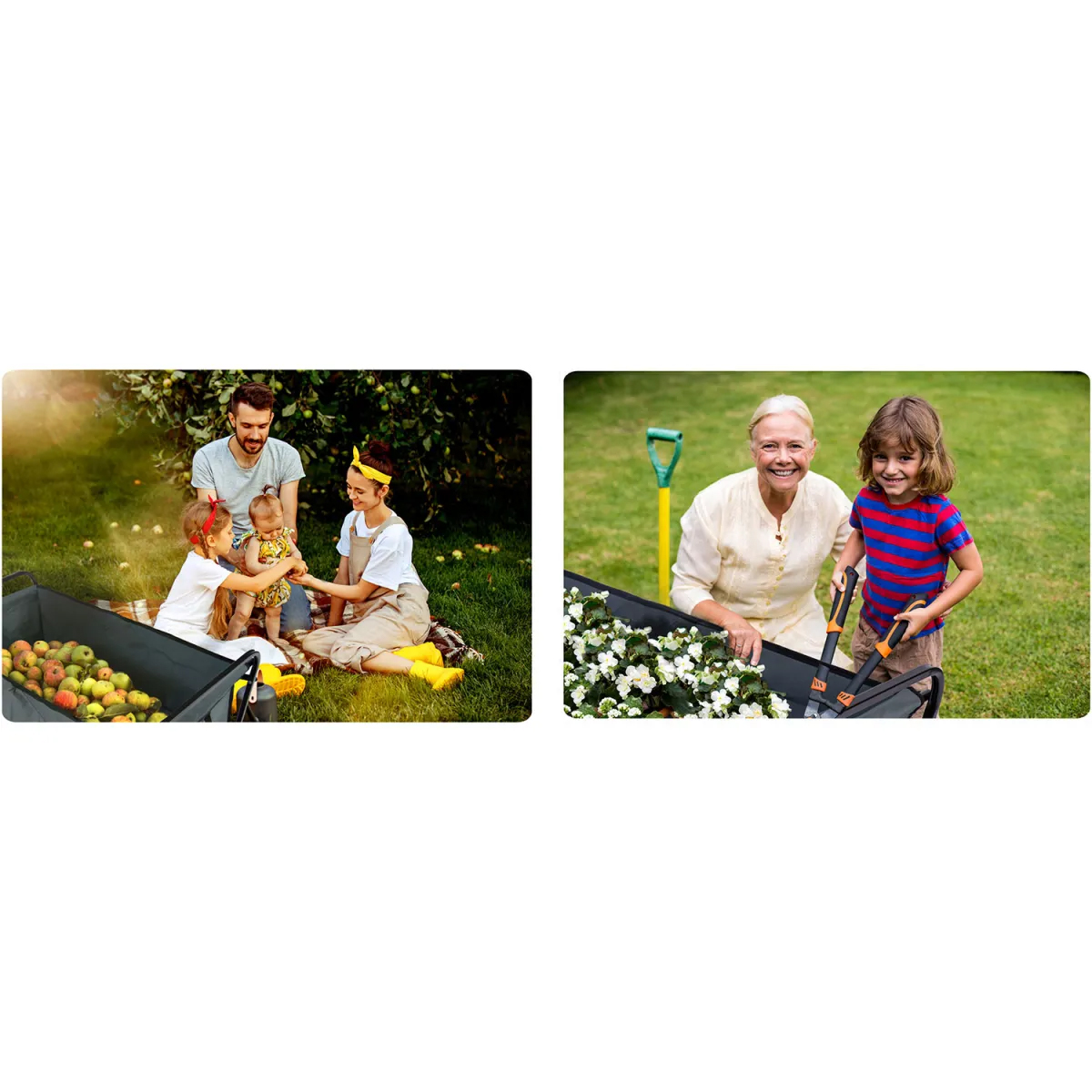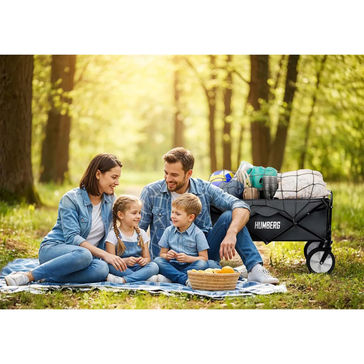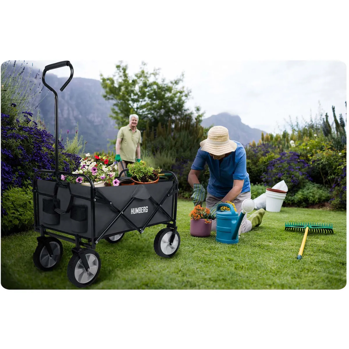 Zložljiv voziček z mrežo HM-511, 80L | Humberg ponuja robustno konstrukcijo, hitro zlaganje in mrežo za pritrditev tovora za udobno rokovanje. Zasnovan je kot vsestranski pomočnik pri prevozu tovora doma, na vrtu ali na potovanjih. Ima trdno jekleno ogrodje s prašnim premazom, kolesa, ki jih je mogoče obračati samo spredaj za lažje manevriranje, in ergonomski ročaj z nedrsečo površino za udobno vodenje.
