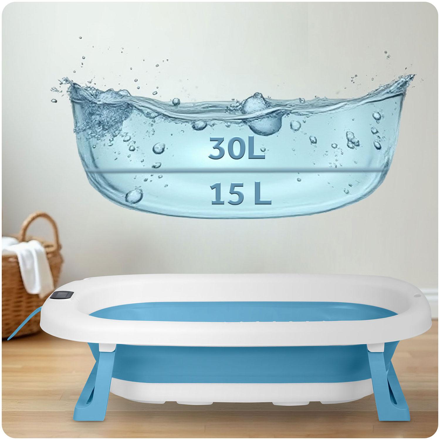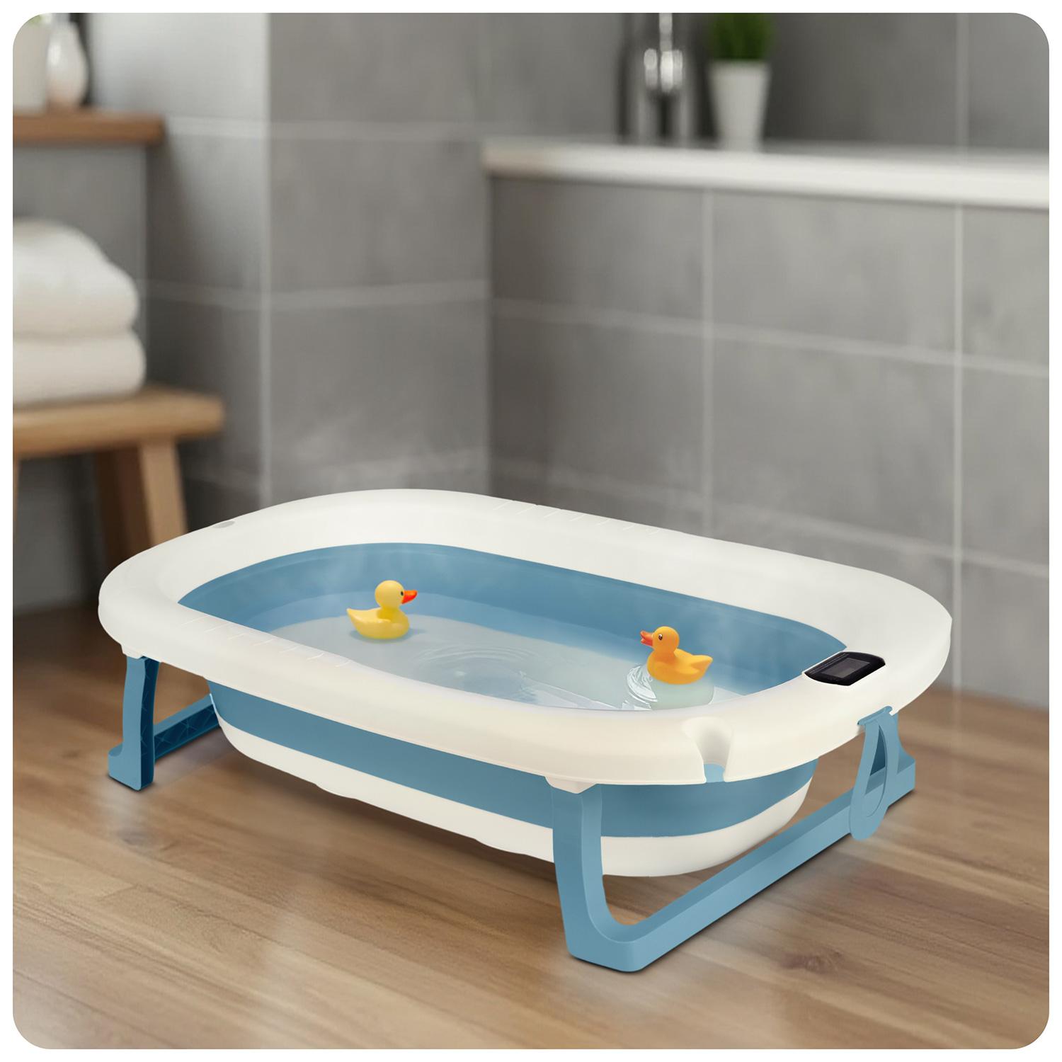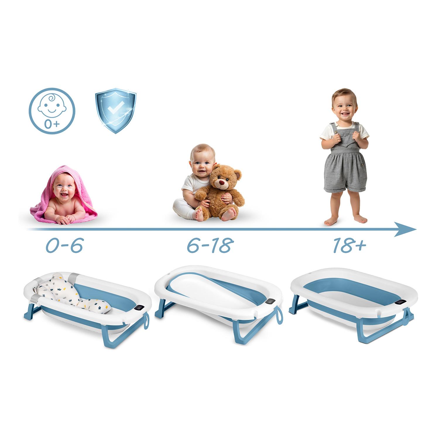 Zasnova združuje trpežne plastične materiale, ki so odporni na vlago in pogosto izpostavljenost vodi. Kombinacija zložljive zasnove, termometra, udobja in varnosti naredi to kad primerno za novorojenčke in malčke, zaradi česar je odlična izbira za starše, ki iščejo praktično rešitev za kopanje doma ali na poti.
