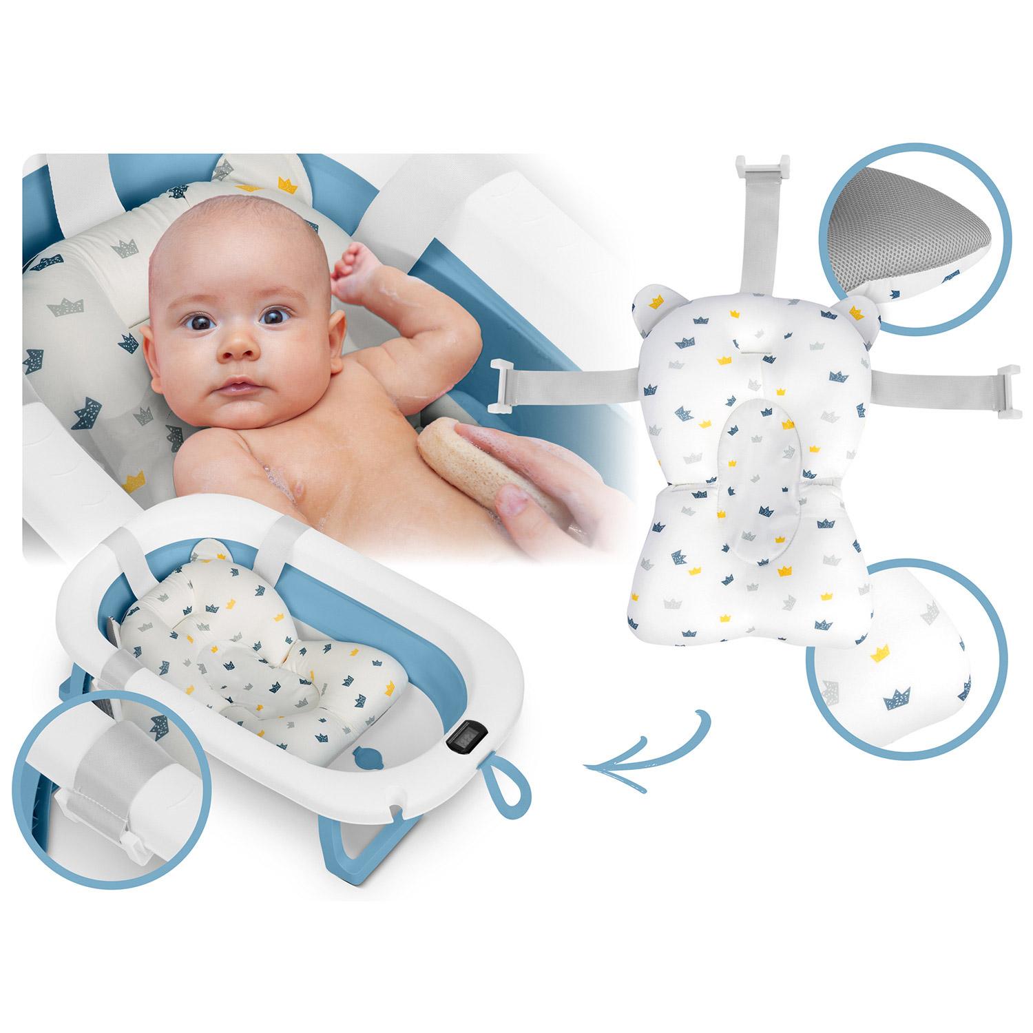 Zložljiva otroška kad s termometrom RK-287 | modra ponuja varno in udobno kopanje, hkrati pa jo je mogoče zložiti in shraniti tudi v manjšem prostoru. Kad je opremljena z mehkim, oblikovanim vložkom, ki nežno podpira glavo in hrbet vašega otroka. Zahvaljujoč trem močnim ročajem ga lahko varno pritrdite na robove kadi – brez zdrsa, brez stresa.