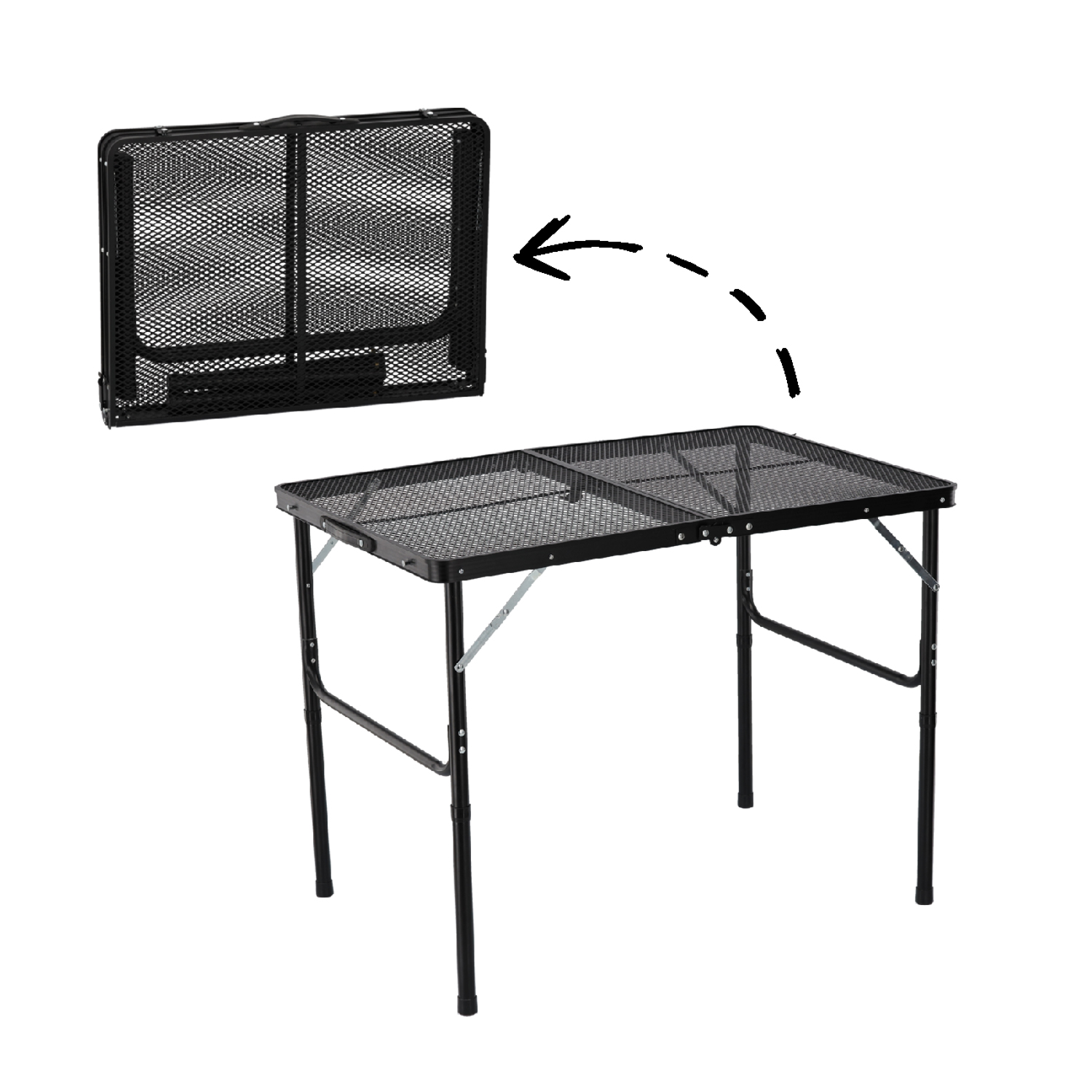 Zložljiva turistična miza, 90x60x40/70cm | črna ponuja praktično in prenosno površino z nastavljivo višino, primerno za notranjo in zunanjo uporabo. Konstrukcija iz trpežnih materialov zagotavlja zadostno stabilnost in daljšo življenjsko dobo tudi pri pogosti uporabi. Preprost mehanizem zlaganja omogoča hitro razstavljanje in zlaganje mize, po zlaganju pa zavzame minimalno prostora in je enostavna za prenašanje ali shranjevanje.